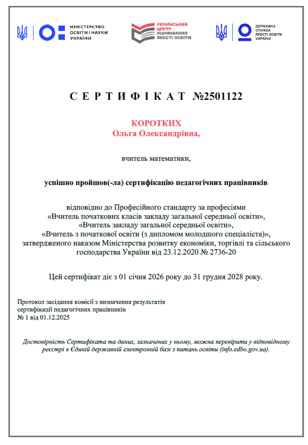 Сертифікація — це складний і відповідальний процес, який передбачає не лише перевірку знань, а й оцінювання професійної діяльності, здатності створювати комфортне та мотивувальне середовище для учнів, уміння застосовувати інноваційні підходи та бути відкритими до нових педагогічних практик.